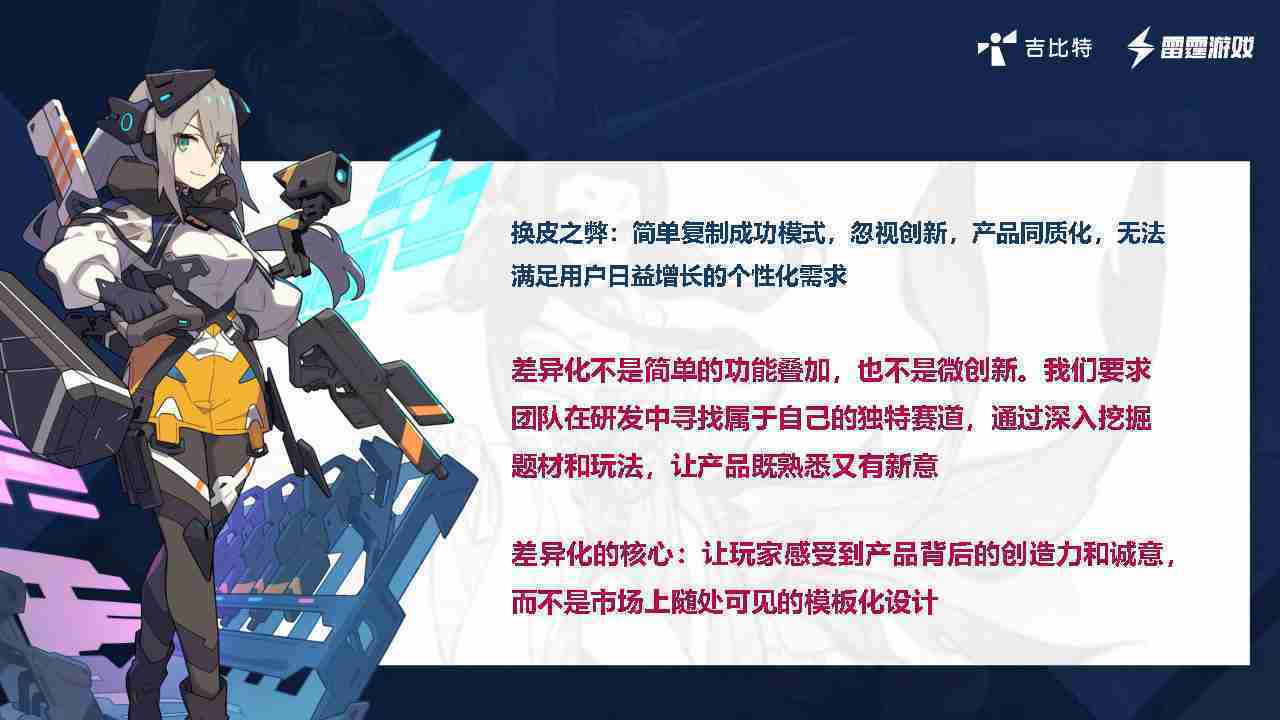 在我们内部是这么定义差异化的。。。。首先,,差异化不是简单的功能叠加,,,,更不是换皮。。。。只是换皮,,,,产品无法提供有效的市场价值。。。。内部经常说差异化的产品不是为了迎合市场,,,,而是找到一个自己独特的表达方式,,,,在研发中找到属于自己的细分赛道和独特赛道,,前提是需要对这个题材有足够的深入、、、、挖掘,,,,对玩法有足够深入的理解,,,,让产品看起来既熟悉又有新意。。