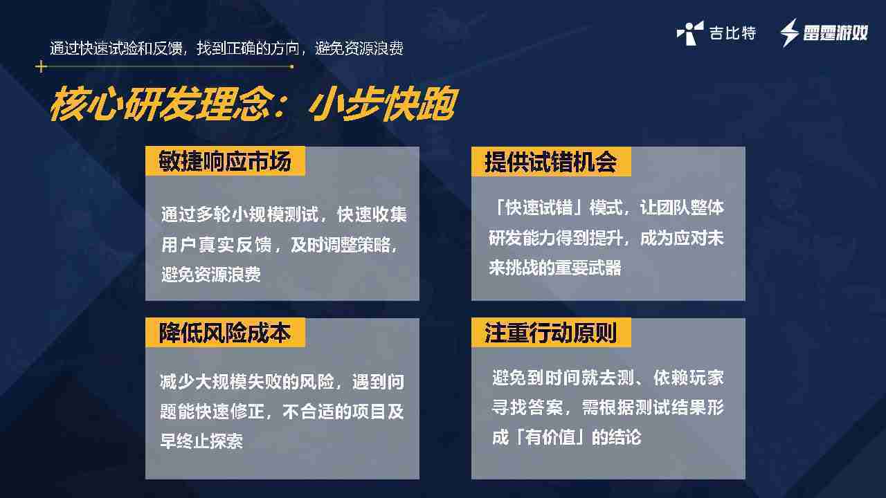 从目前的实践来看,,,,内容向确实不合适,,,因为小步快跑更适合做玩法的尝试,,,,但是如果是内容项,,玩法已经确定的,,,这时候应该做切片,,,而不是做小步快跑的方式,,,因为做切片的成本是很高的。。。。我们有过两个项目,,要花很长时间做切片的内容,,,,而切片内容只占整个项目的1/10,,,,但要花的时间成本、、、人力成本、、、、经济成本可能会到1/3,,,所以用很短的时间做游戏的原型,,验证其好不好玩,,是想尝试在粗糙表达的情况下,,,看看能否获得非常好的留存表现。。如果留存表现非常好,,,证明游戏内容体验是比较准确和非常好的内核,,,我们会尝试加外围内容的拓展。。。。