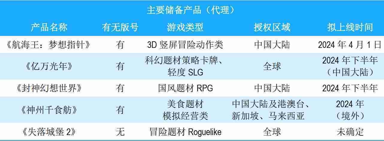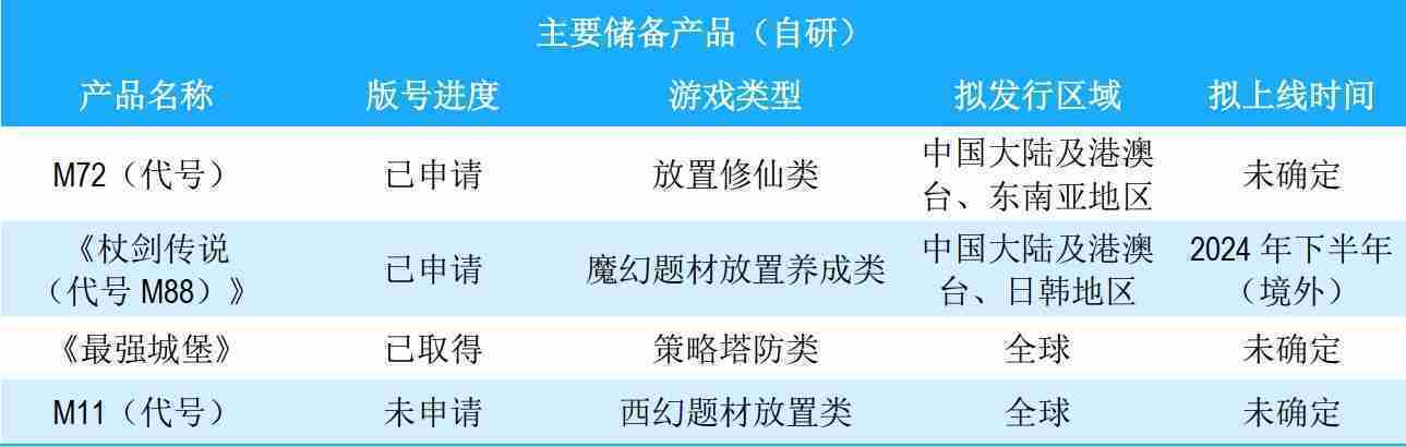 公司储备的多个自研、、、代理产品都在有序推进当中,,,,涵盖放置类、、、策略类、、、、模拟经营类、、、、RPG、、、Roguelike等多元化游戏品类,,,,储备的主要自研和代理产品如下:::